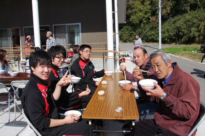 おにーさんも、みんなで一緒に芋煮とおにぎりを食べています。
