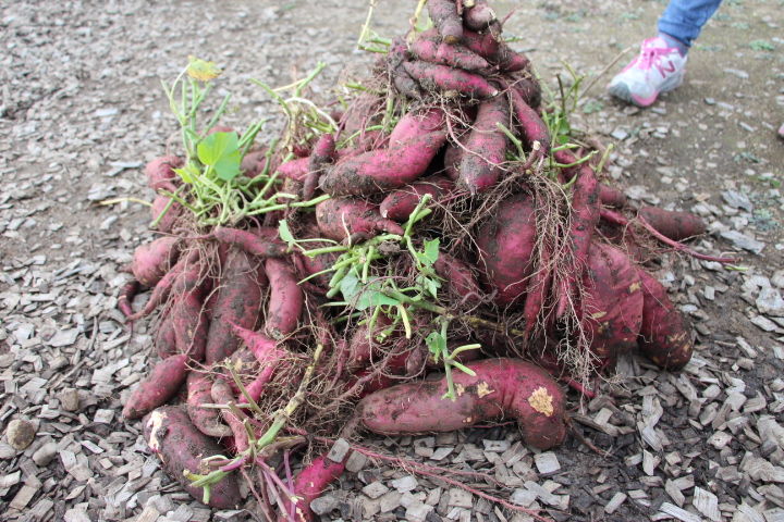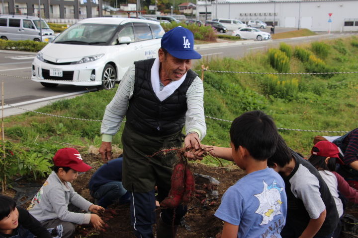 子ども達は自分が抜いた大きなサツマイモを先生に誇らしげに見せています。