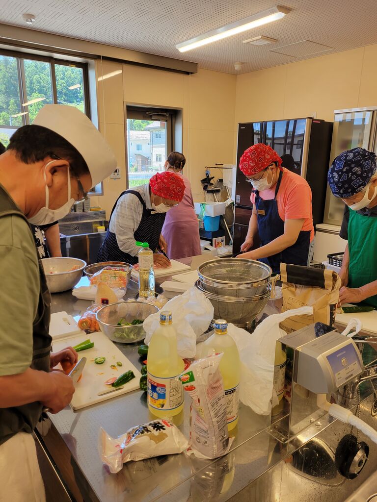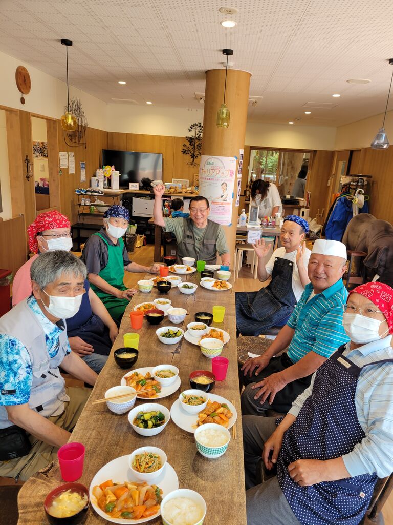 今日は福島大学の学生さんも参加してくれており、男の料理教室の参加者が学生さんに手取り足取り(実際には足は取っていませんが)野菜の切り方から魚のさばき方までレクチャーしています。やはり福島県浜通りで生まれ育った皆さんですから、魚のさばき方は惚れ惚れする腕前です。