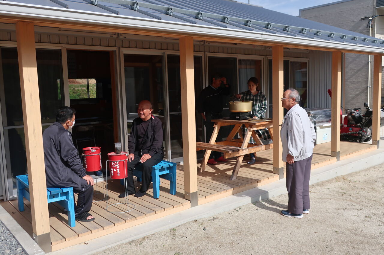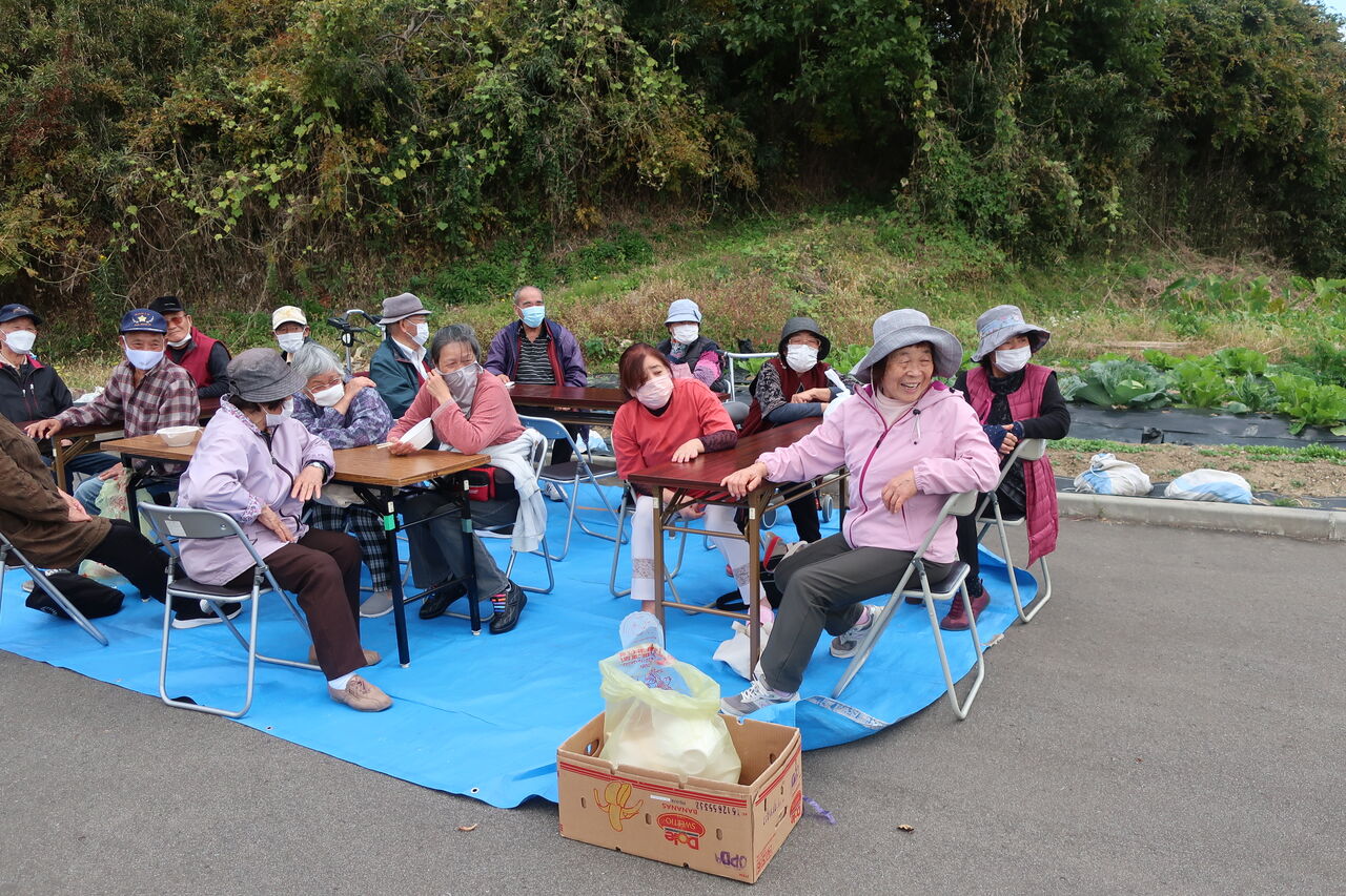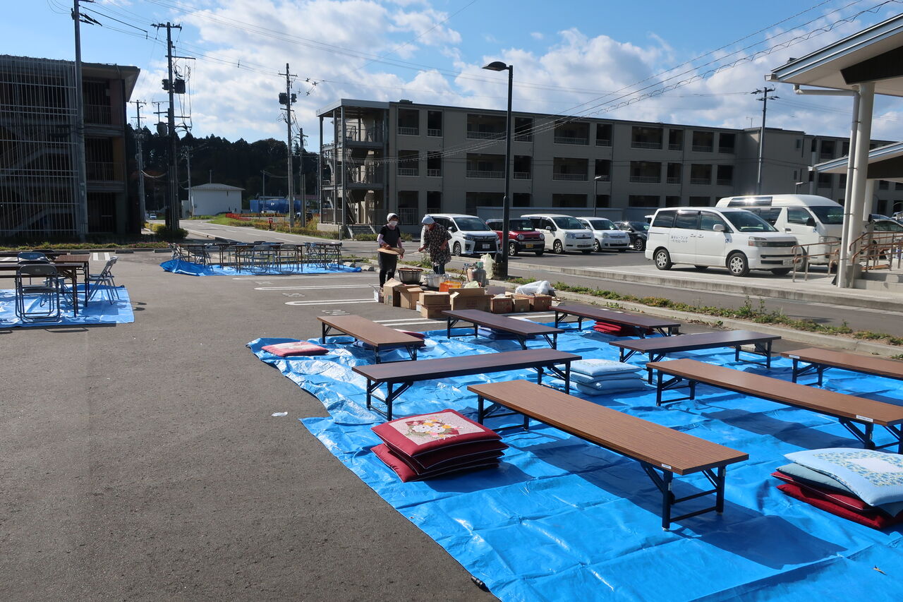 まずは会場設営です。多くの方が集まってくれる予定なので、集会所内だけでは密になることを避けることが出来ません。ですので集会所前の駐車場を使わせて頂き、青空収穫祭です。今日は気温も20℃弱と屋外でも過ごしやすいです。きっと日頃の皆さんの行いが良いのでしょう。