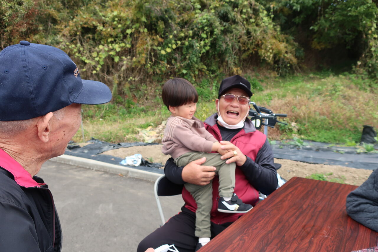 子ども達とふれ合って笑顔になっている大人の姿です。孫かひ孫ぐらいの子どもを抱っこさせてもらって、満面の笑みになっています。
